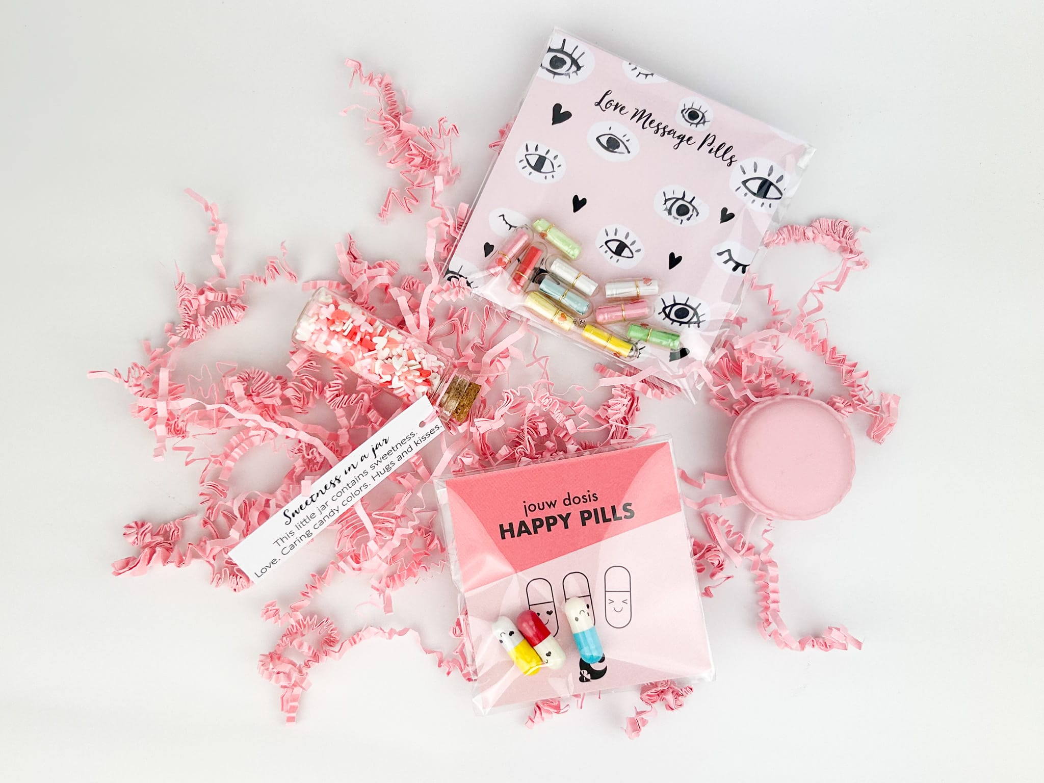 - Love Pills Zakje met 10 pilletjes waarin kleine briefjes zitten. Vul ze met jouw persoonlijke boodschap vol liefde.