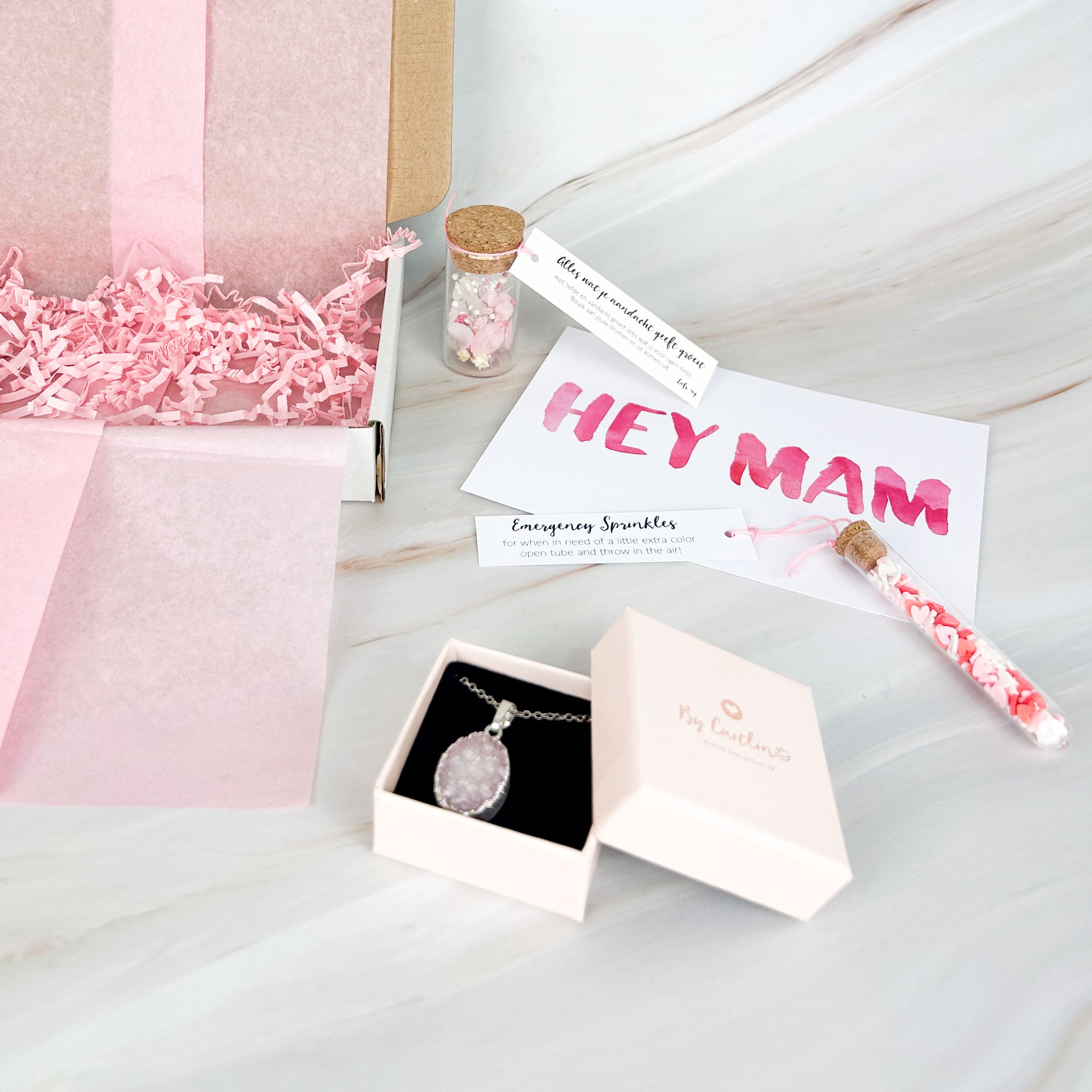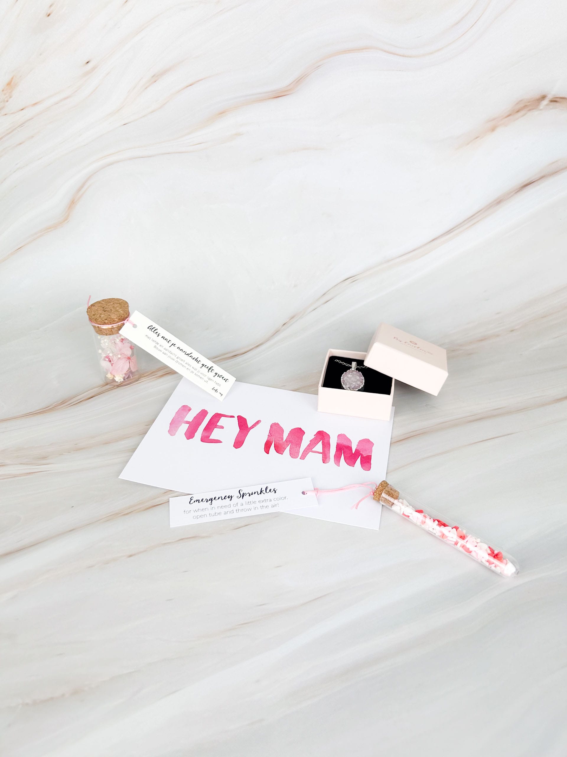 Daarnaast zit er een droogbloemenflesje bij, met zachte kleuren en een subtiele uitstraling, perfect als blijvende herinnering. De vrolijke postkaart met de tekst HEY MAM maakt het pakket helemaal af. Alles is met liefde ingepakt in roze tinten voor een extra feestelijk gevoel
